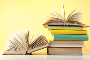 Open book, hardback books on wooden table. Education background. Back to school. Copy space for text.